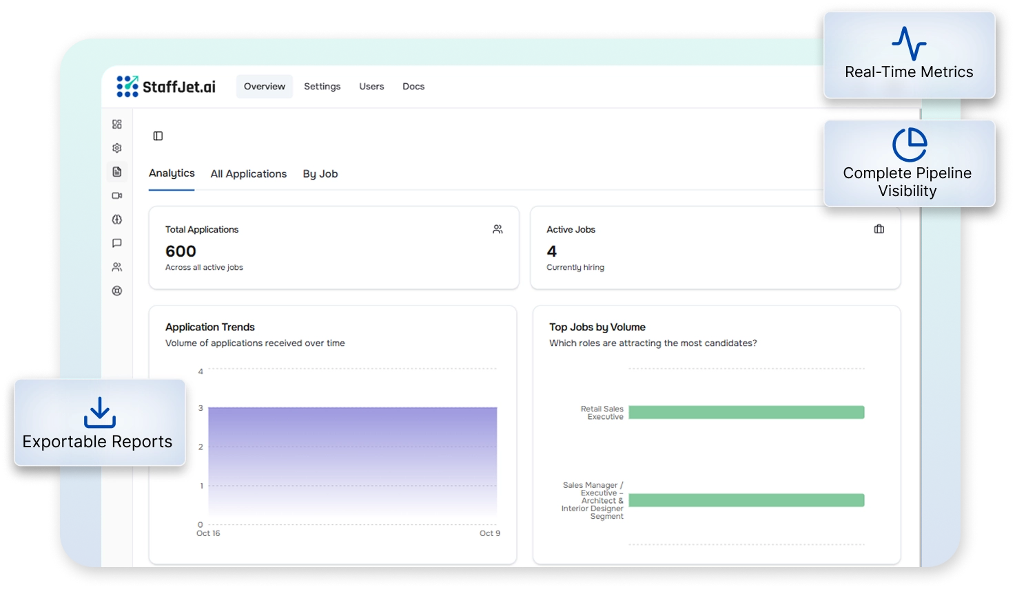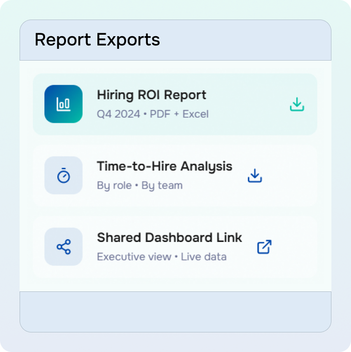Export hiring data for leadership. Prove ROI with concrete numbers. Shareable dashboards available.