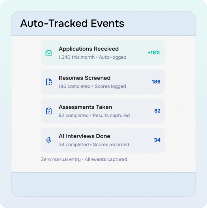 Every application, screening, assessment, interview logged automatically. No manual data entry needed.