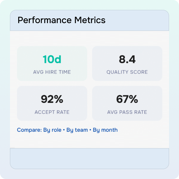 Time-to-hire, pass rates, quality metrics calculated automatically. Compare across roles, teams, time periods.