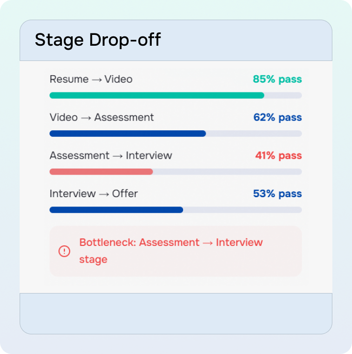 Candidate progression through stages tracked real-time. Drop-off points identified instantly.