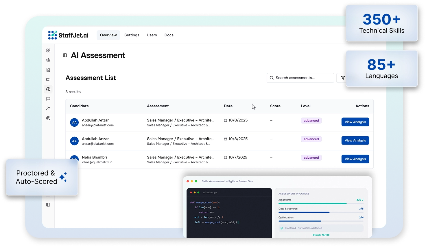 Question-by-question breakdown. Skills verified, gaps identified. Compare candidates objectively.