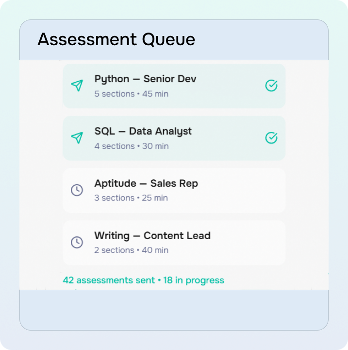 Engineering gets coding challenges. Sales gets aptitude tests. Content roles get writing assessments. AI adapts per role.