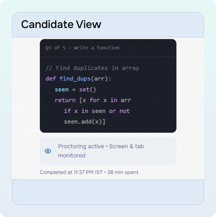 Coding challenges, logic tests, role-based scenarios completed on their schedule. Proctored automatically.