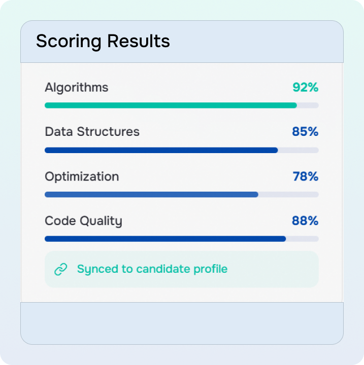 Performance evaluated instantly. Results integrated directly into candidate profiles.