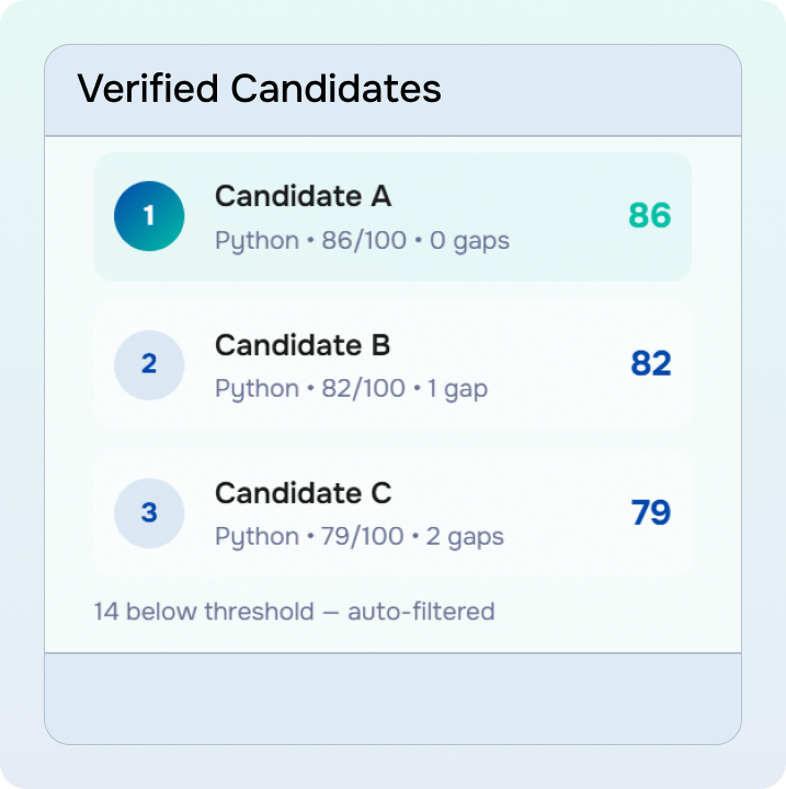 Question-by-question breakdown available. Strengths, weaknesses, skill gaps identified. Interview only verified talent.